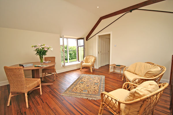 Upstairs, there are a further two en-suite bedrooms, one twin and one double. Both are large and spacious. The double bedroom contains a king-size bed, with romantic bedside lighting. There is also the gallery sitting room which makes a perfect location for evening drinks, or quiet reading and reflection. All the upstairs rooms have stunning views over the surrounding countryside, which you can get a taste of from the photographs.